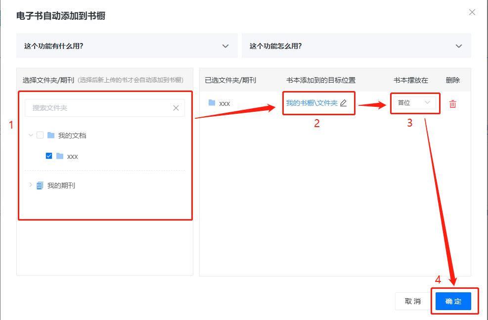 (2)左側選擇文件夾/期刊,右側選擇書本添加到的目標位置和擺放位置,后續在所選文件夾/期刊內新上傳的書,將會自動添加到該書櫥內。