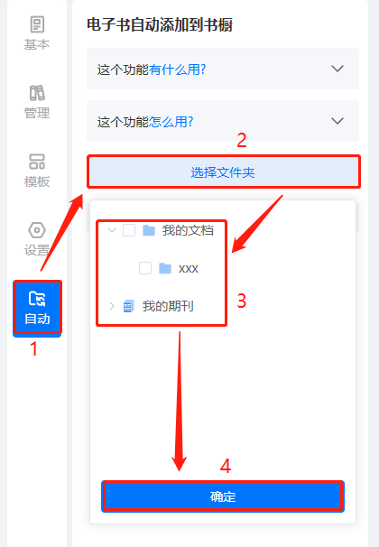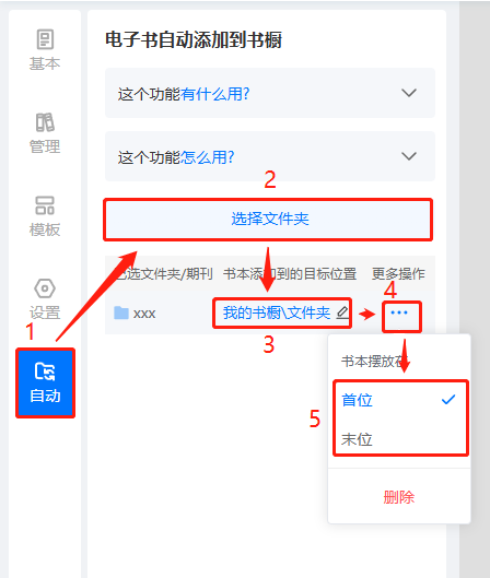 (2)先點擊【自動】,再點擊【選擇文件夾】,勾選文件夾/期刊,選擇書本需要添加到的目標位置和擺放位置,后續在所選文件夾/期刊內新上傳的書,將會自動添加到該書櫥內。