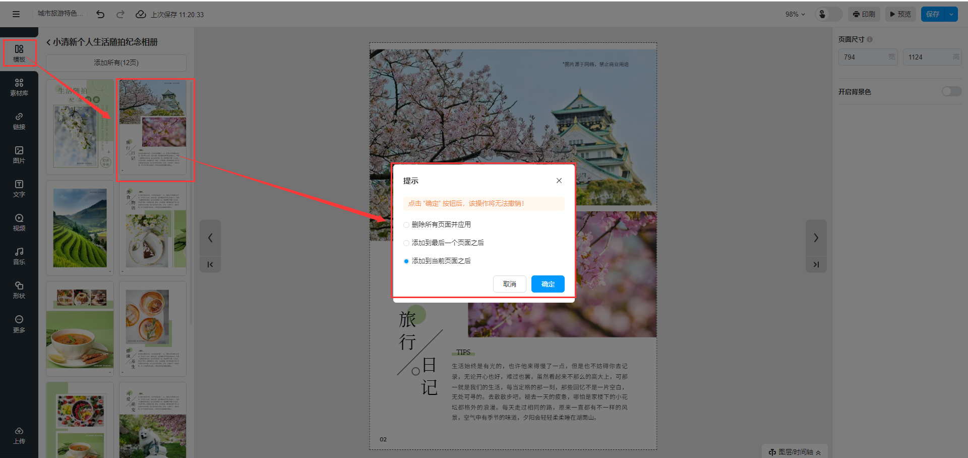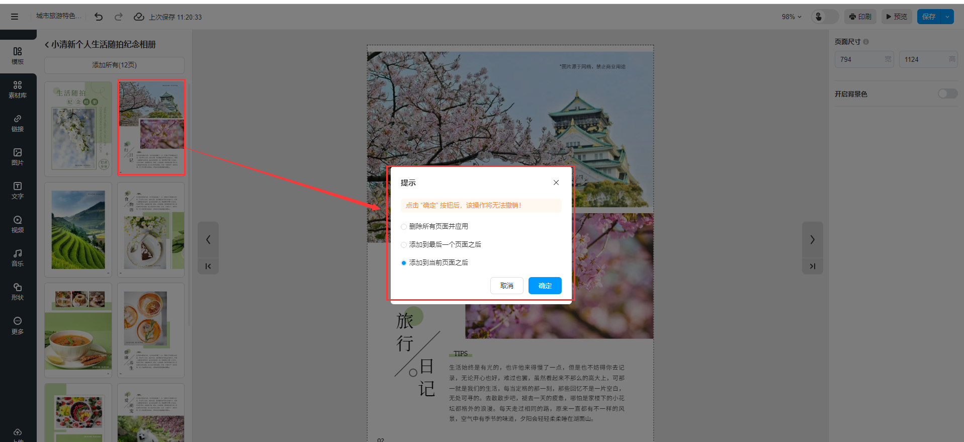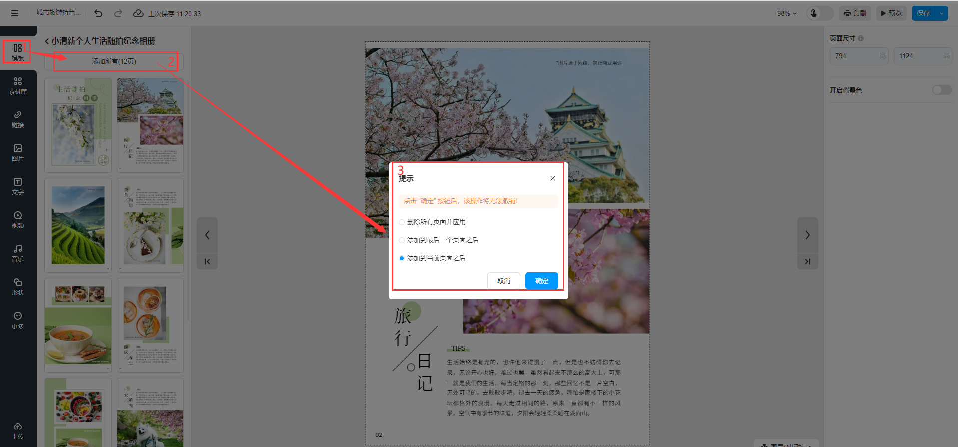 如果你想應用模板的全部頁面,可選擇【添加所有頁】,并選擇模板應用方式,點擊【確定】。