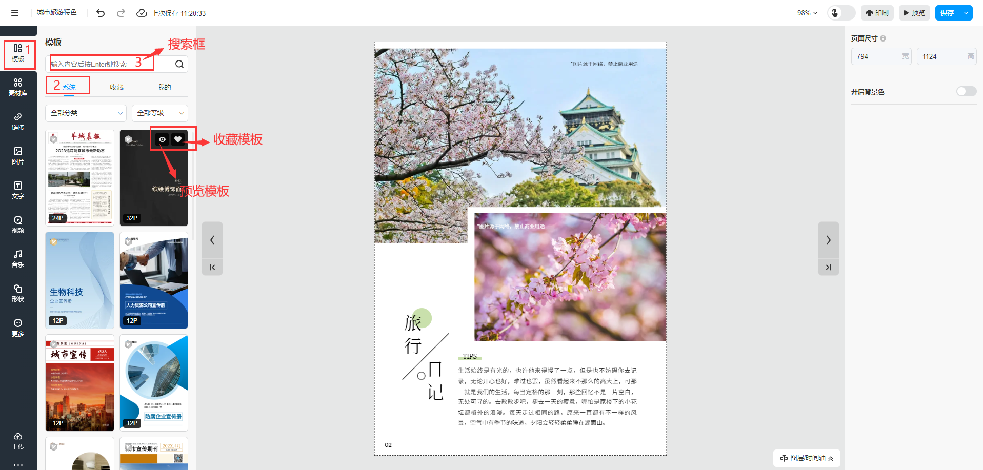 點擊左側功能欄【模板】,可以通過上方搜索框中直接查找模板,也可以選擇【系統】進入系統模板頁面,滑動模板欄選擇心儀模板。