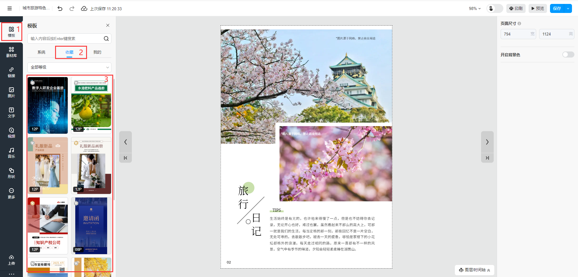 點擊左側功能欄【模板】,選擇【收藏】進入你的收藏模板頁面,滑動模板欄選擇選擇心儀模板。