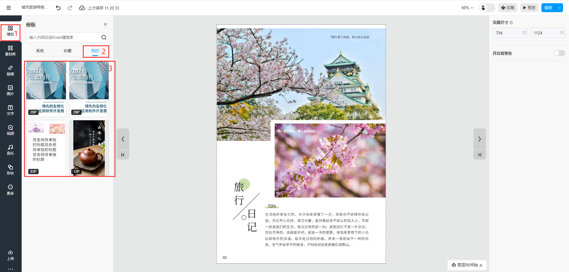 你也可以選擇自制的模板進行設計,之前另存為新模板的所有電子書模板會顯示在【我的】里面。