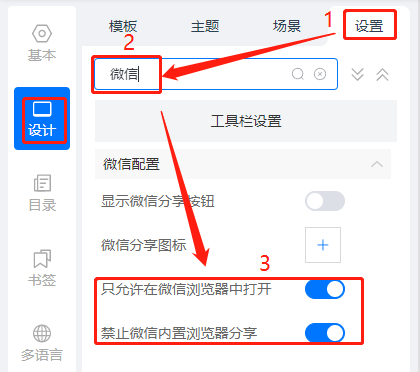 點擊【設計】,點擊【設置】,搜索框搜索【微信】,打開以下兩個配置