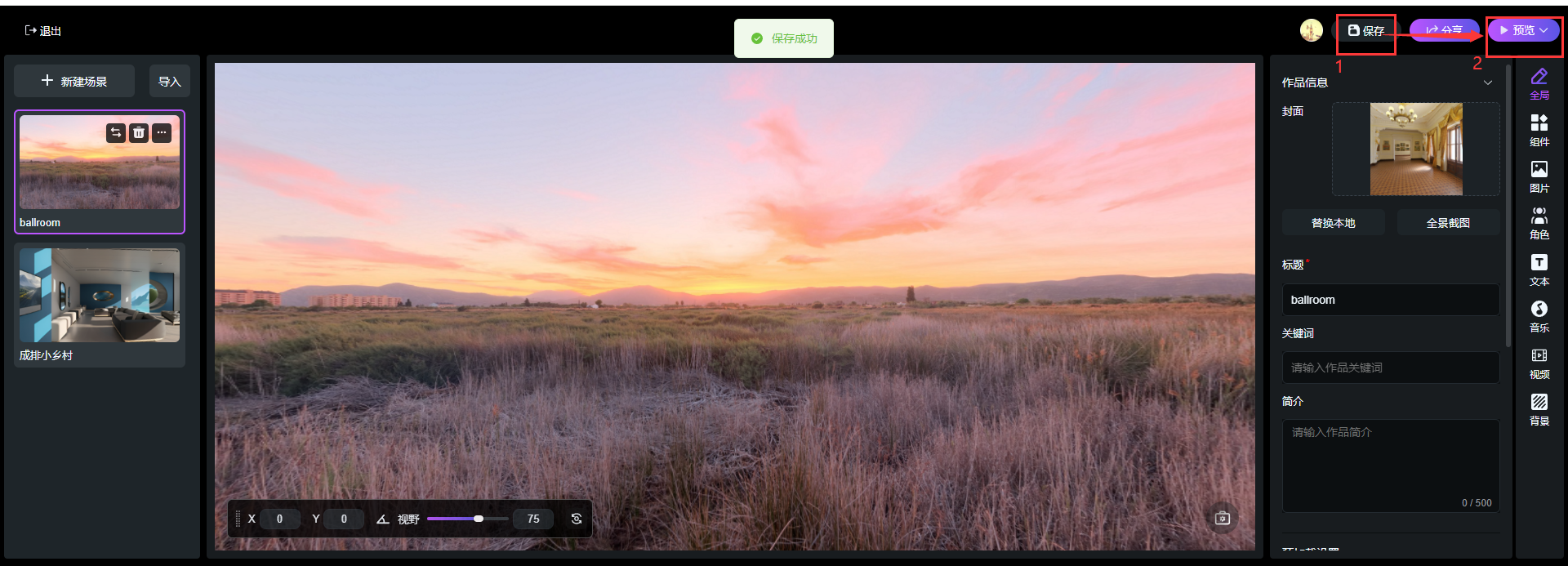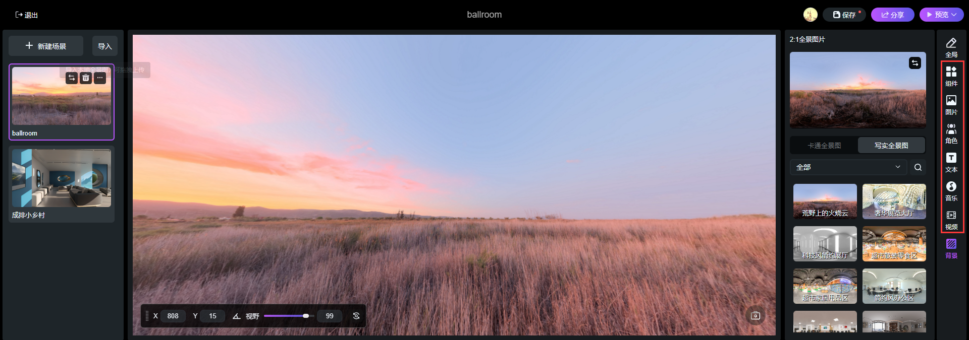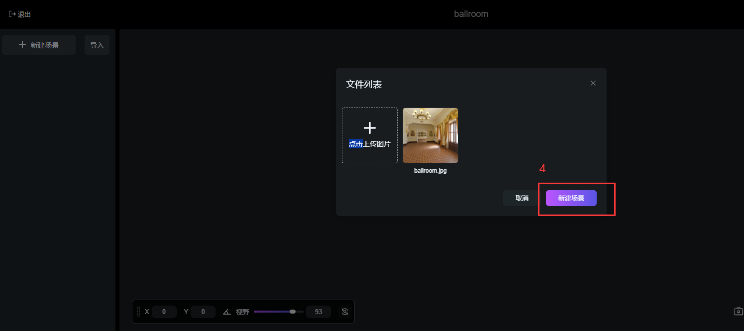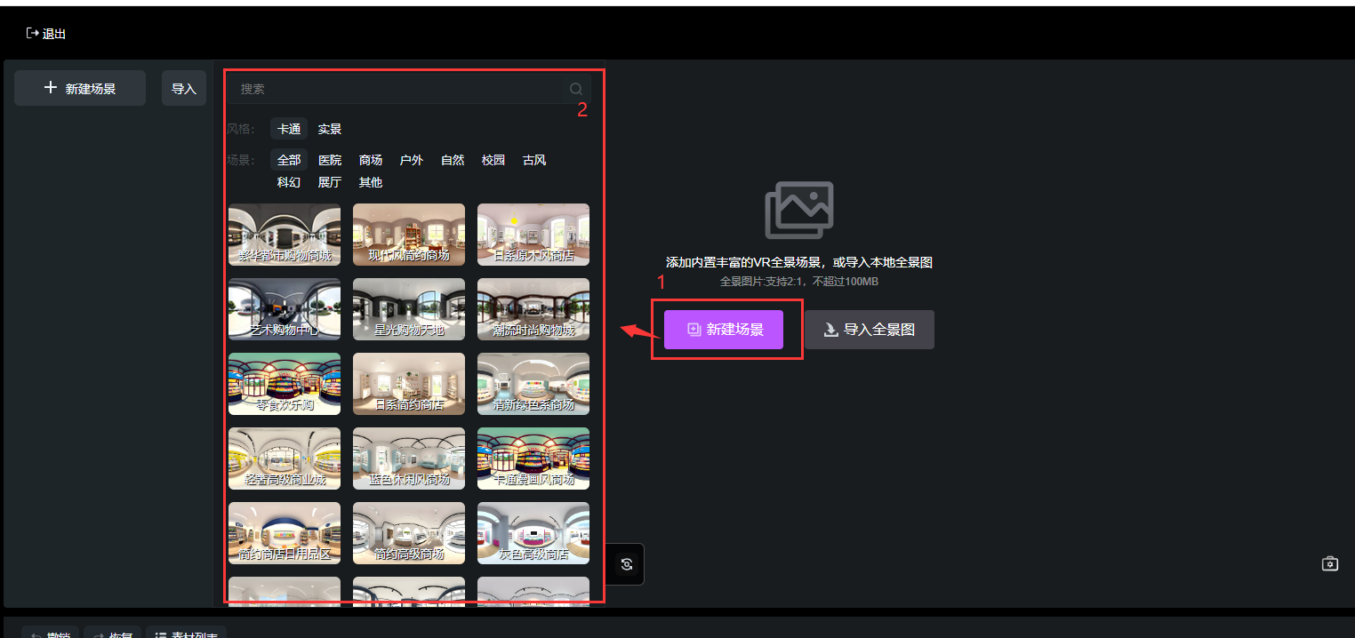 點擊【新建場景】添加內置豐富的VR全景場景