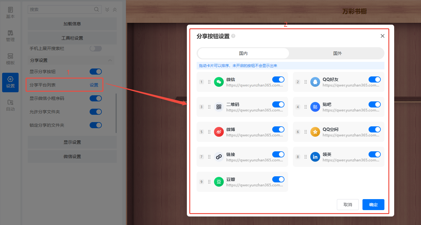 - 分享平臺列表:編輯排列分享按鈕中的國內或者國外的平臺列表