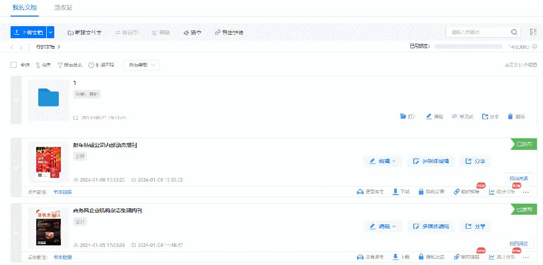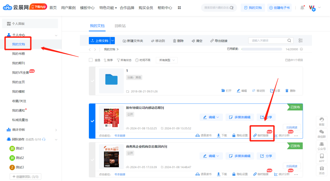 1、點擊“我的文檔”選擇需要設置的電子畫冊,點擊下方“臨時鏈接”可進行設置。
