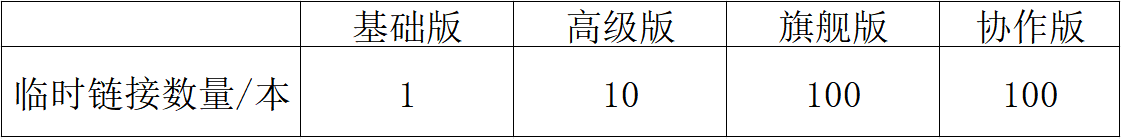 溫馨提示:“臨時鏈接”功能需基礎版及以上會員才可使用,各版本對于每本書可創建的臨時鏈接數量不不同,如圖: