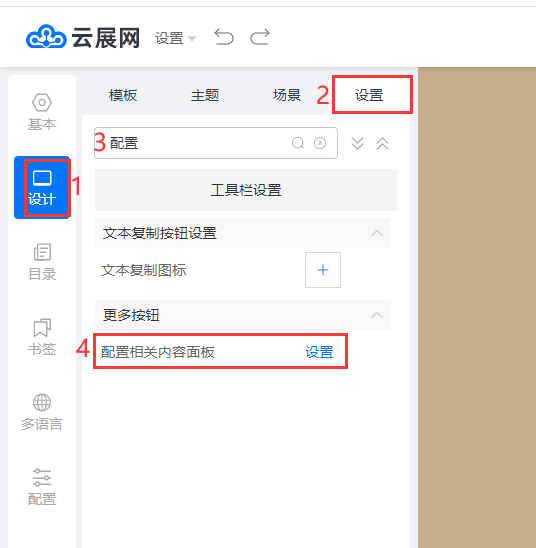 點擊【設計】,點擊【設置】,在搜索欄輸入”配置”查找,點擊【配置相關內容面板】設置
