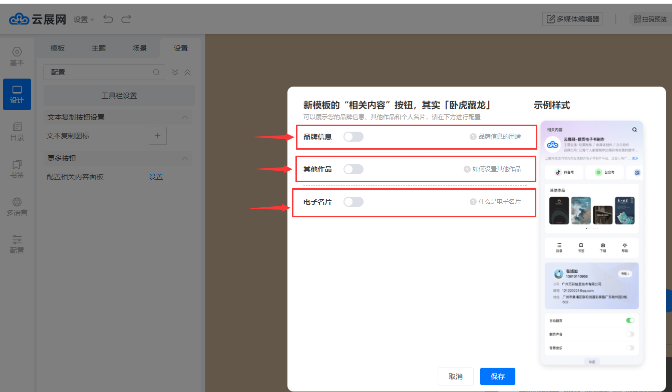 “相關內容”面板功能有三個,【品牌信息】、【其他作品】、【電子名片】。