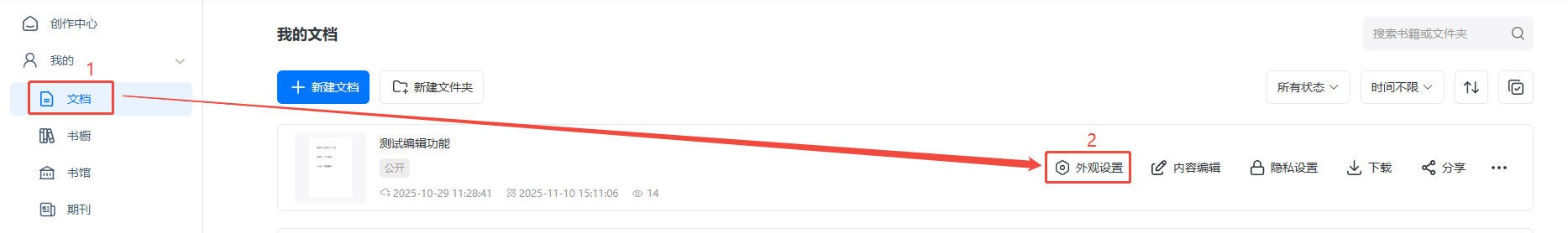 點(diǎn)擊【文檔】,選擇需要設(shè)置的電子書,點(diǎn)擊【外觀設(shè)置】。