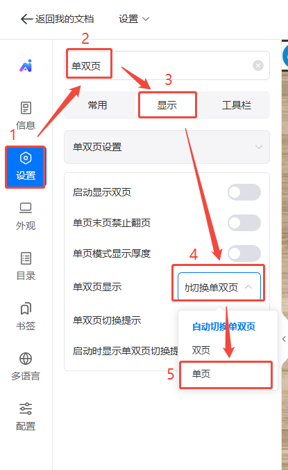 電腦端打開電子書是默認(rèn)雙頁顯示的,需要單頁顯示可以在后臺(tái)設(shè)置一下實(shí)現(xiàn)單頁翻頁效果(移動(dòng)端默認(rèn)豎屏單頁翻頁效果,無需設(shè)置)。