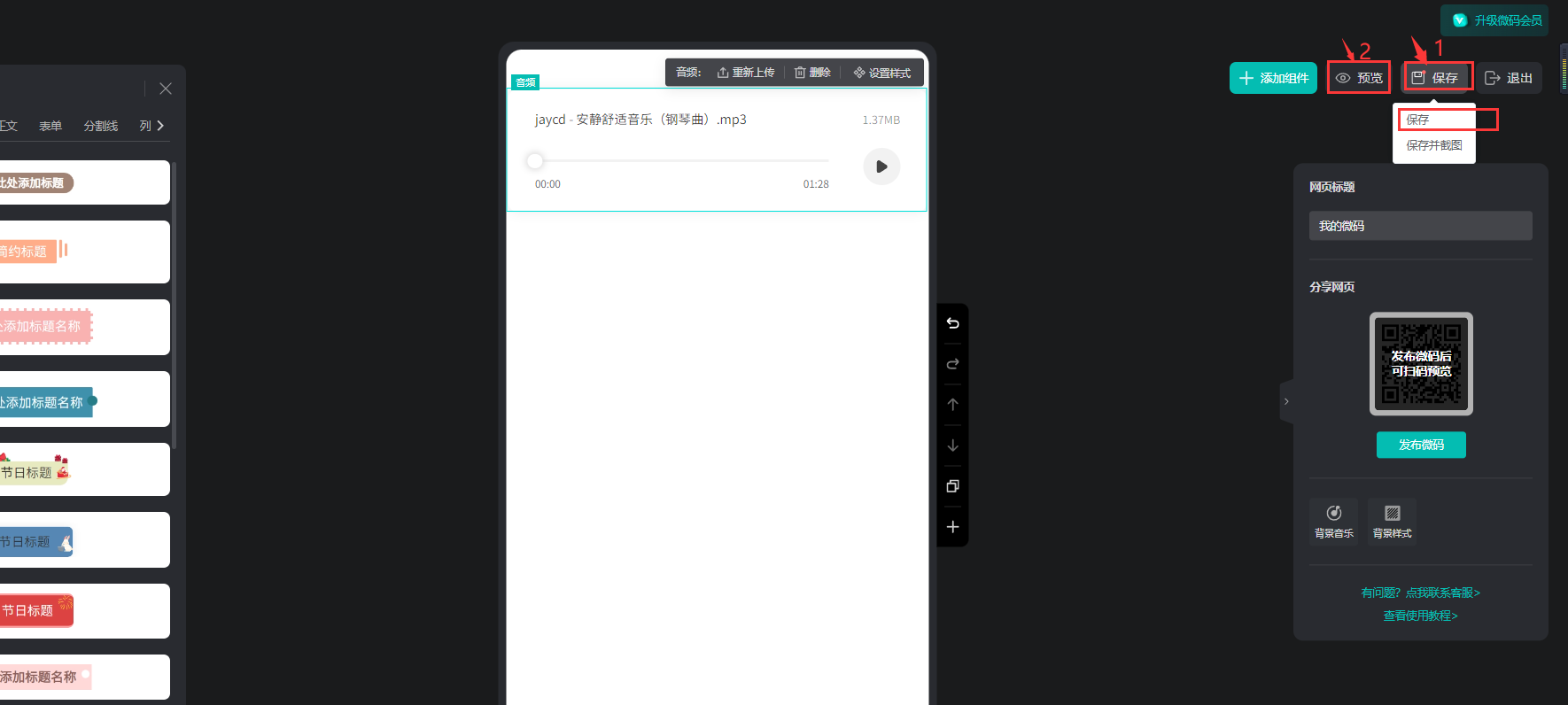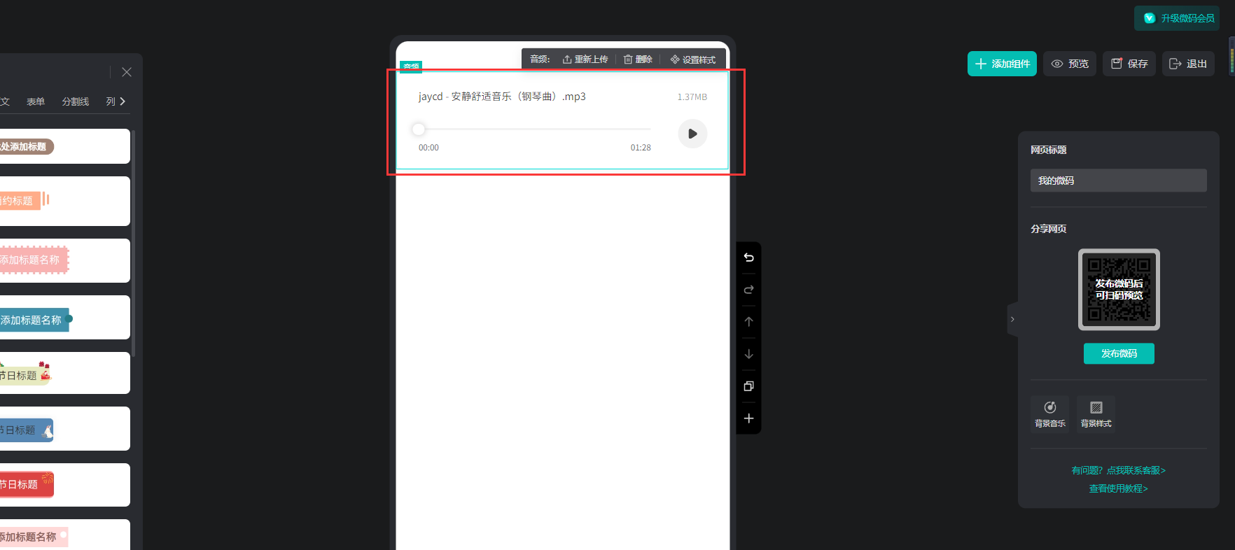 點(diǎn)擊【添加組件】,點(diǎn)擊【音頻】,上傳mp3格式的音頻文件添加到頁面上