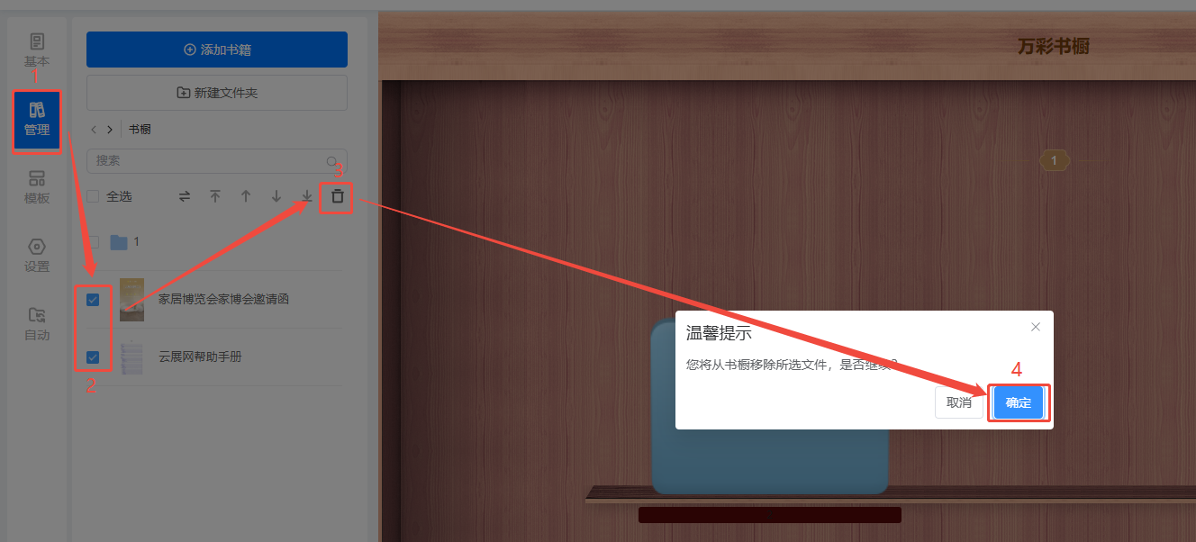 b)先點擊【管理】,勾選需要移除的書籍,點擊垃圾桶圖標,最后點擊確定即可移除書籍。