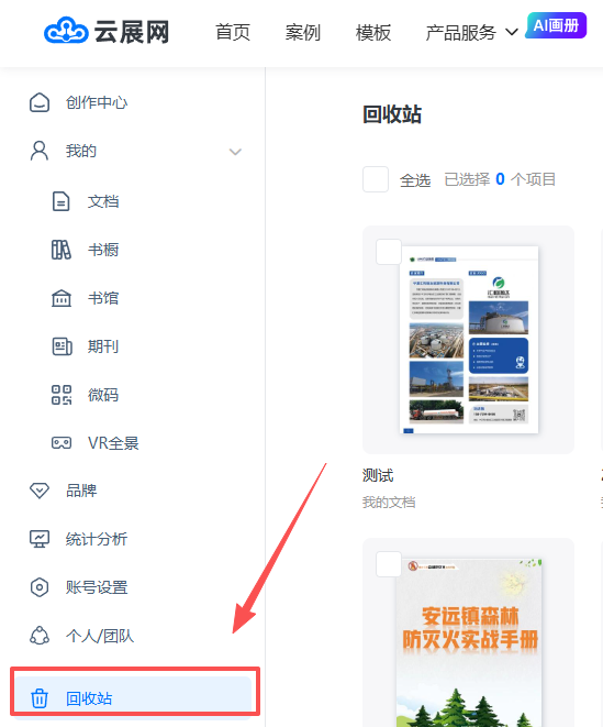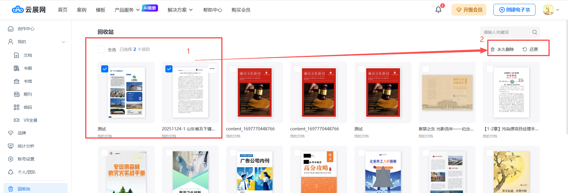 1) 選擇雜志文件后,點擊“還原”或“永久刪除”。若選擇還原,書籍將回到原文件夾;若選擇永久刪除,書籍將不再存儲于云展網,且無法找回。