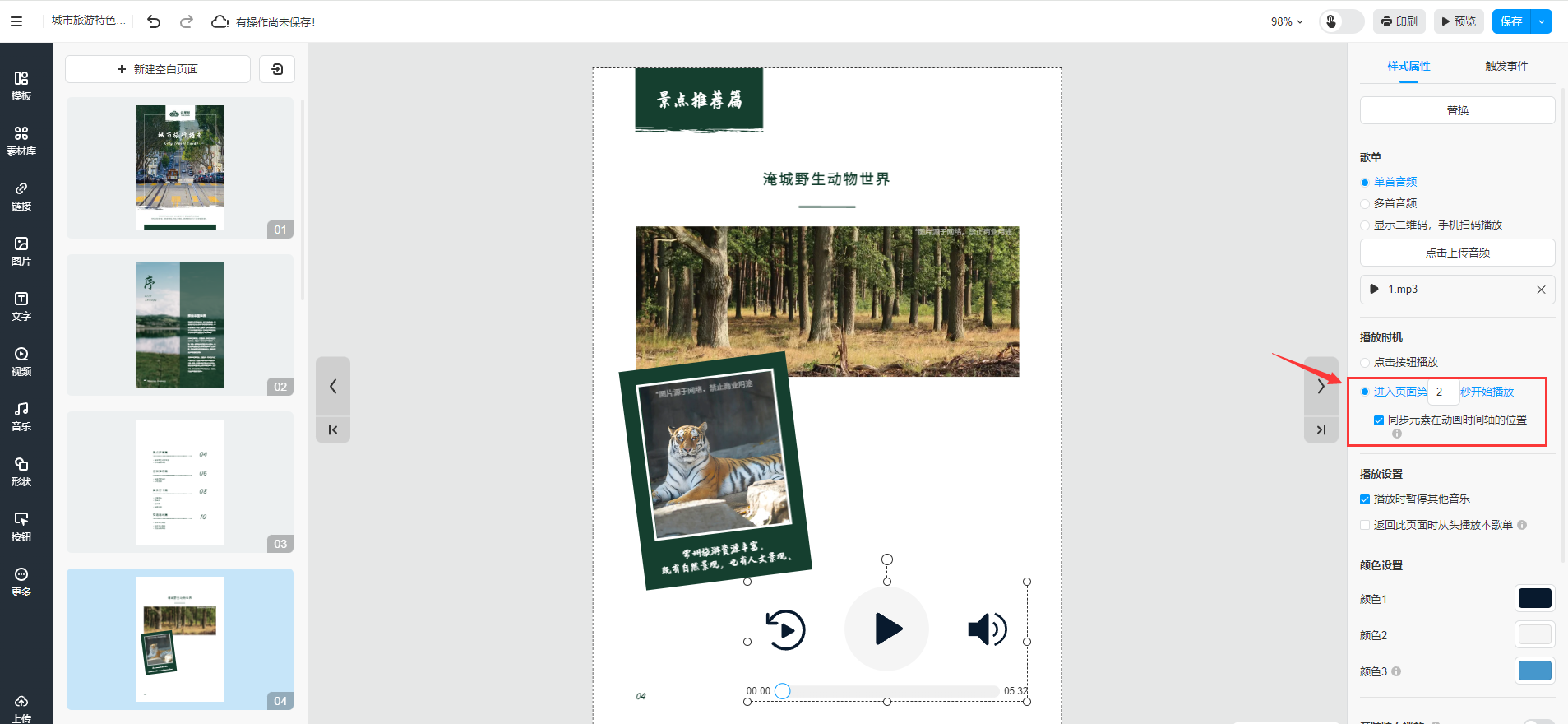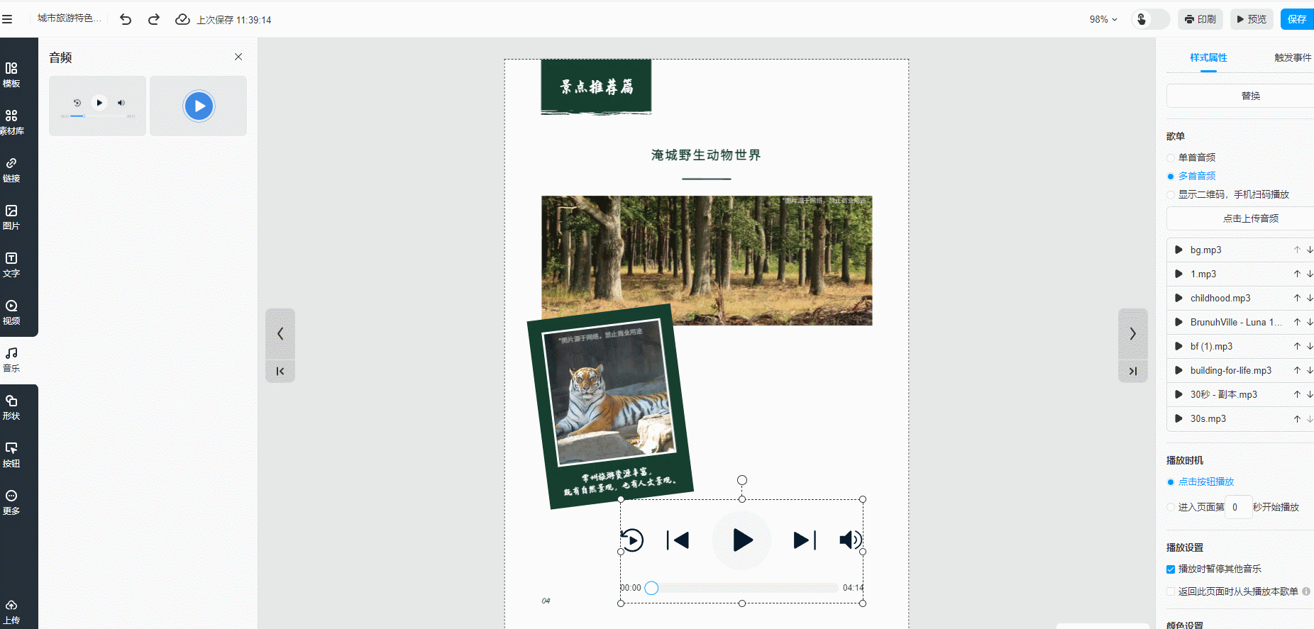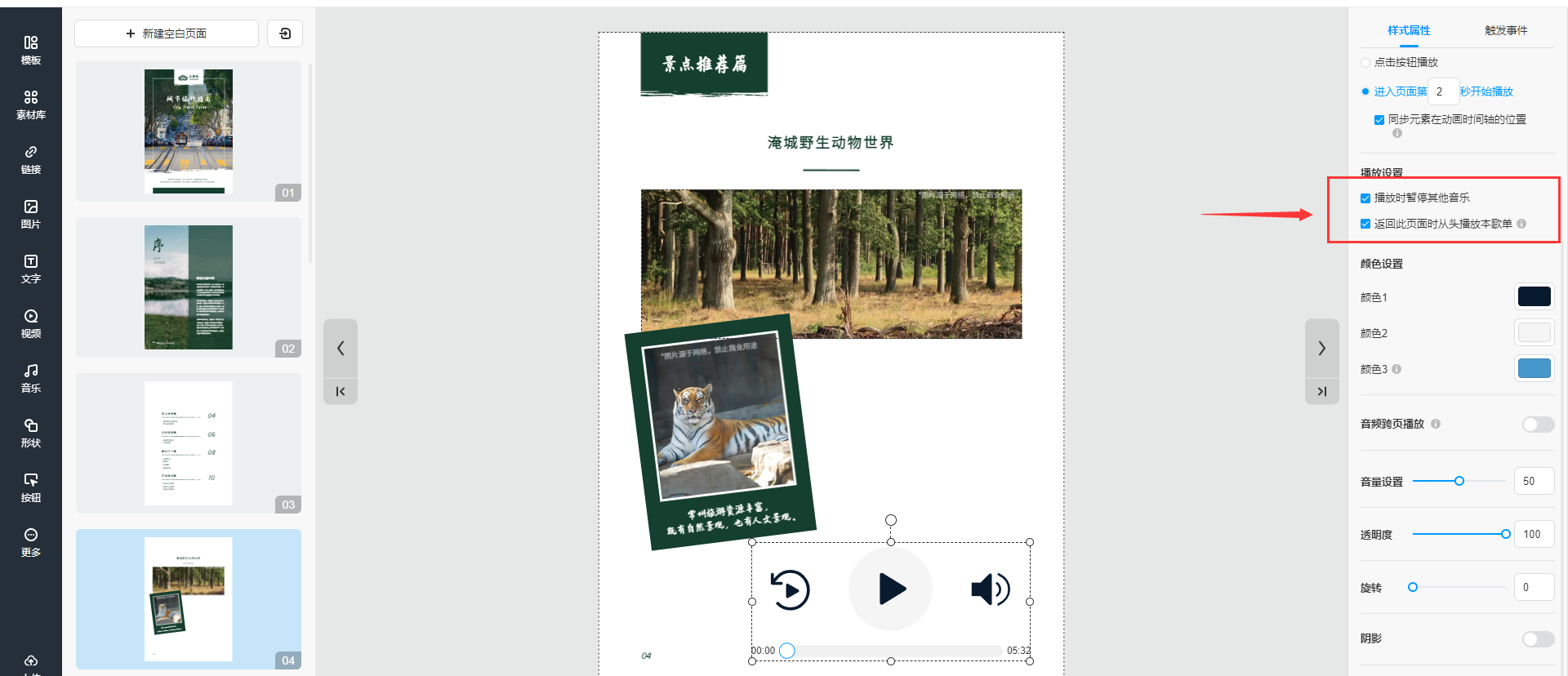 根據你的需求,在屬性面板中你可以上傳音樂,設置音樂播放方式,自定義音樂控件的顏色、陰影、位置大小以及旋轉。