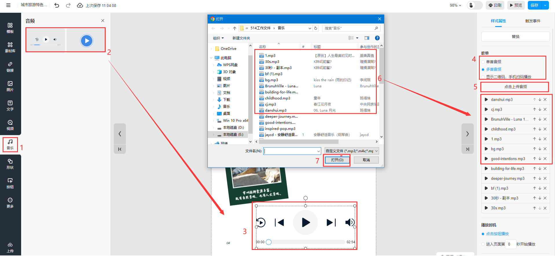 點擊【音樂】選擇音樂控件至畫布,設置在畫布的位置和大小,在屬性面板,選擇【播放器類型】后點擊【點擊上傳音頻】,選擇音樂后點擊【打開】。