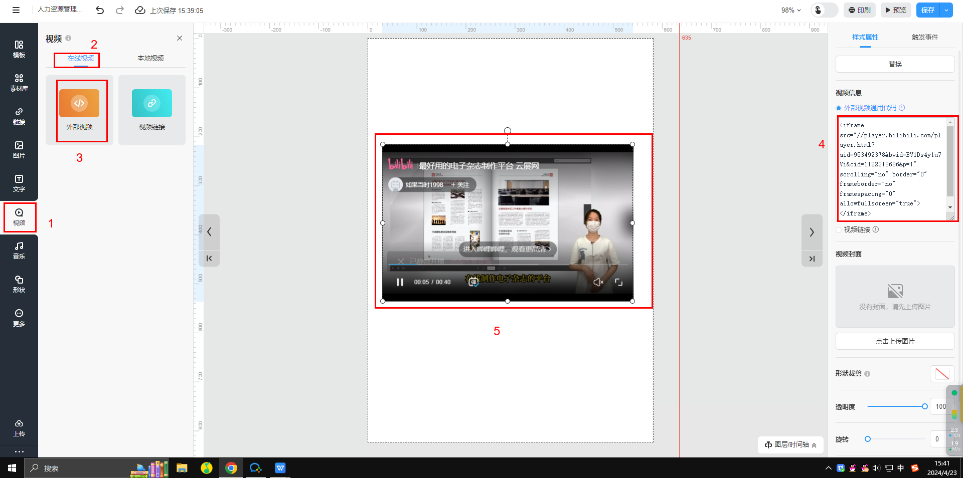 點(diǎn)擊【外部視頻】將視頻框放至畫(huà)布,把你的視頻上傳到第三方視頻網(wǎng)站如:bilibili,騰訊,愛(ài)奇藝等,上傳以后通過(guò)點(diǎn)擊分享來(lái)獲取內(nèi)嵌代碼,并輸入到【外部視頻通用代碼】里生成視頻,調(diào)整視頻框的位置和大小。