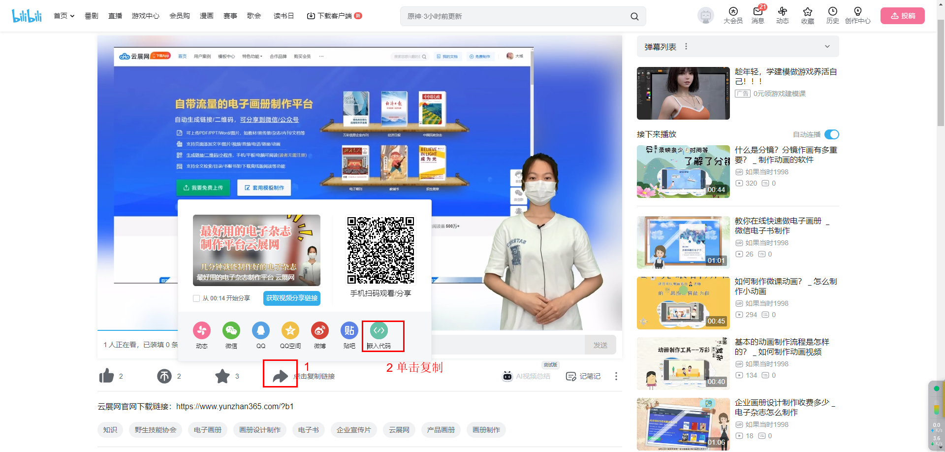 打開(kāi)視頻網(wǎng)站,如嗶哩嗶哩,點(diǎn)擊分享按鈕,單擊復(fù)制嵌入代碼。