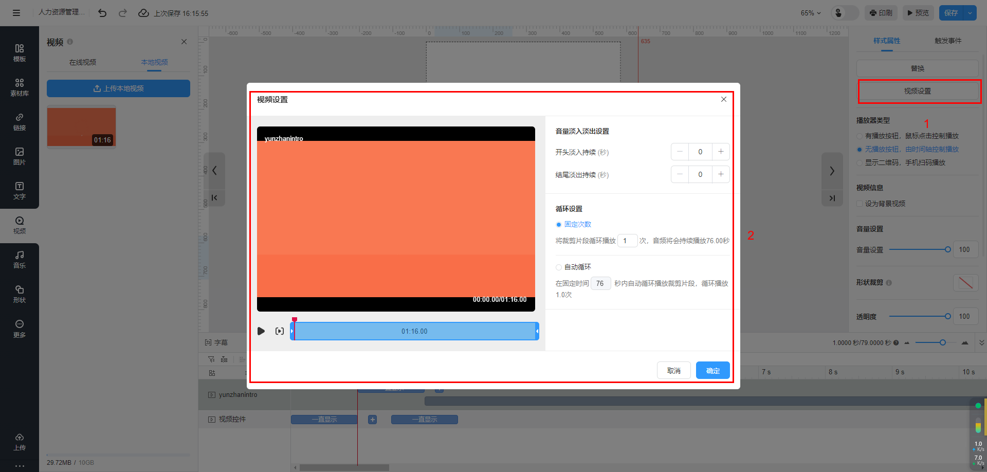 溫馨提示:【無(wú)播放按鈕,由時(shí)間軸控制播放】?jī)H支持上傳本地視頻類(lèi)型勾選。