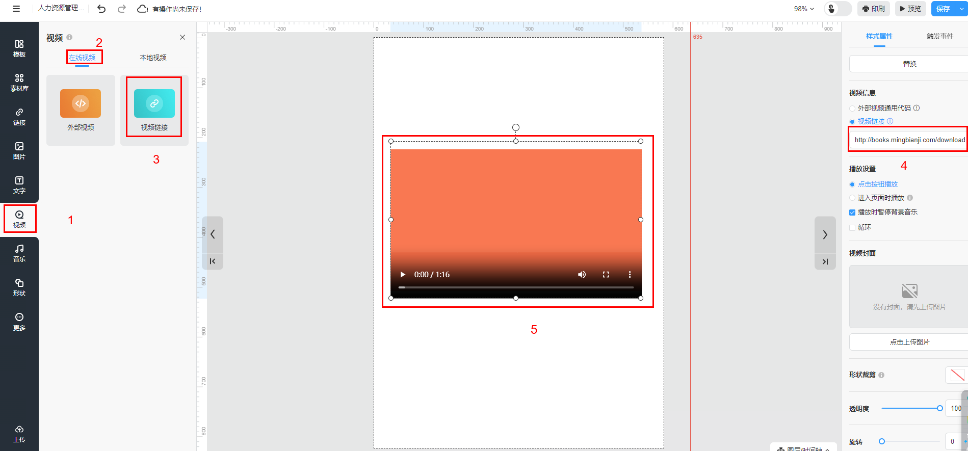 點(diǎn)擊【視頻鏈接】將視頻框放至畫(huà)布,調(diào)整視頻框的位置和大小,將你的視頻鏈接輸入到【視頻鏈接】。