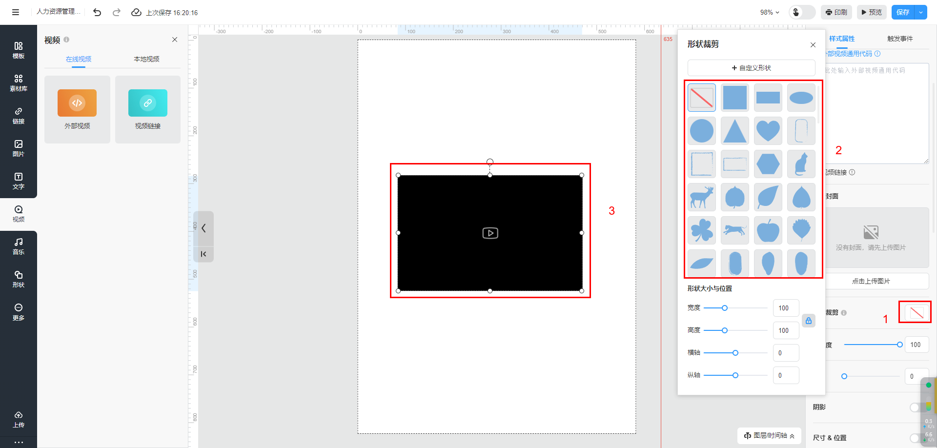 溫馨提示:在進(jìn)行形狀裁剪時(shí),請(qǐng)注意不要裁剪掉播放控件,或者你也可以選擇“進(jìn)入頁(yè)面時(shí)自動(dòng)播放”選項(xiàng),以便在使用形狀裁剪時(shí)保持播放的順暢。