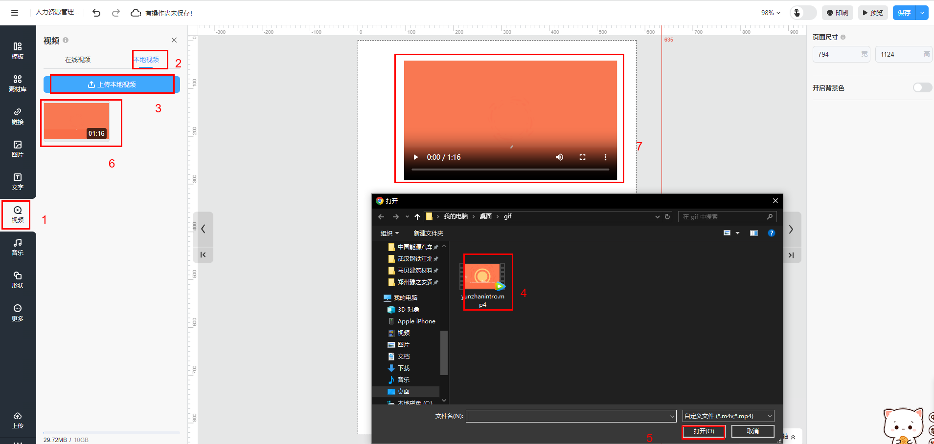 點(diǎn)擊【上傳本地視頻】,選中視頻后選擇【打開(kāi)】,上傳完成后,選中視頻并單擊到畫(huà)布,并調(diào)整視頻框在畫(huà)布的位置和大小。你可以也在對(duì)本地視頻進(jìn)行刪除、上傳封面操作。