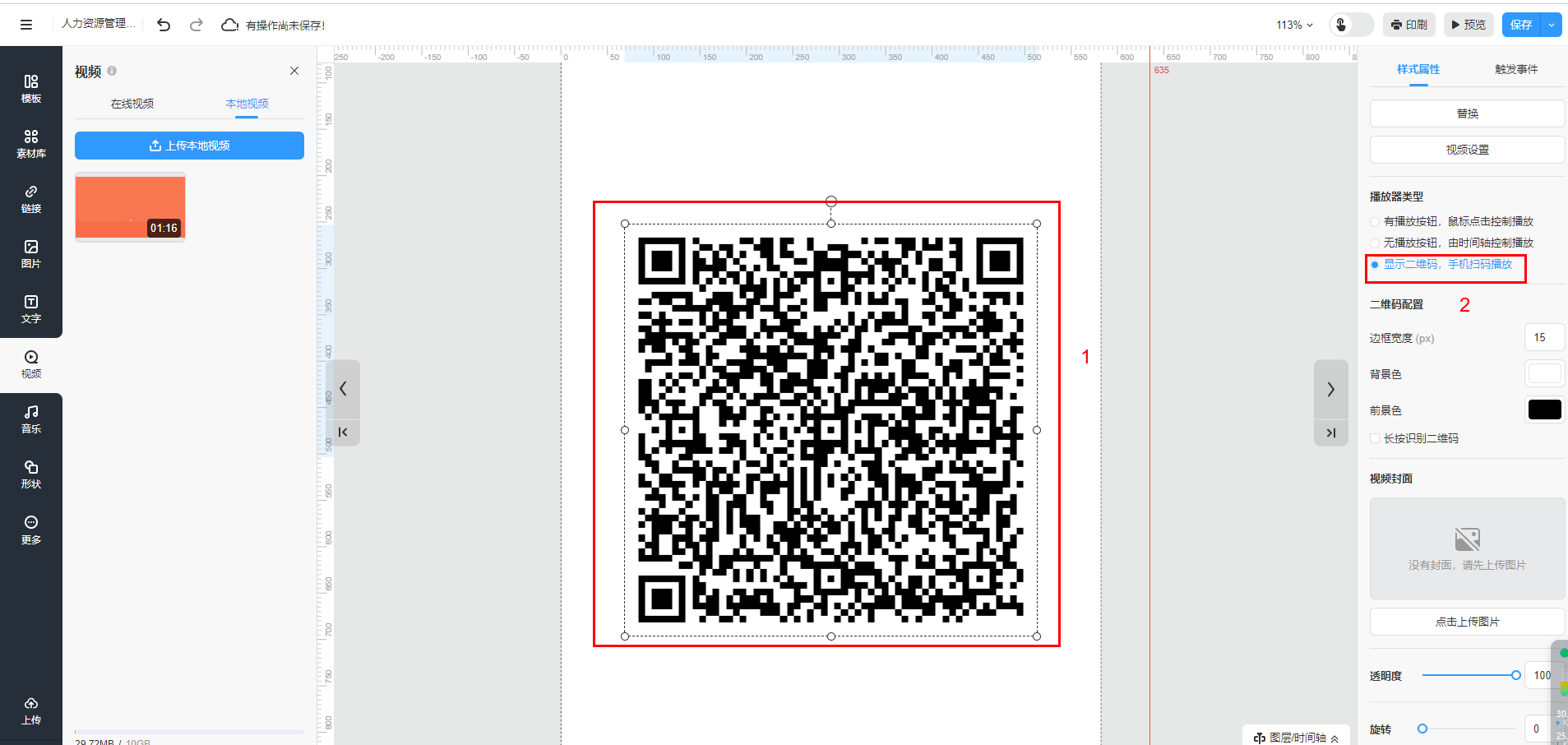 插入本地視頻后,勾選【顯示二維碼,手機(jī)掃碼播放】