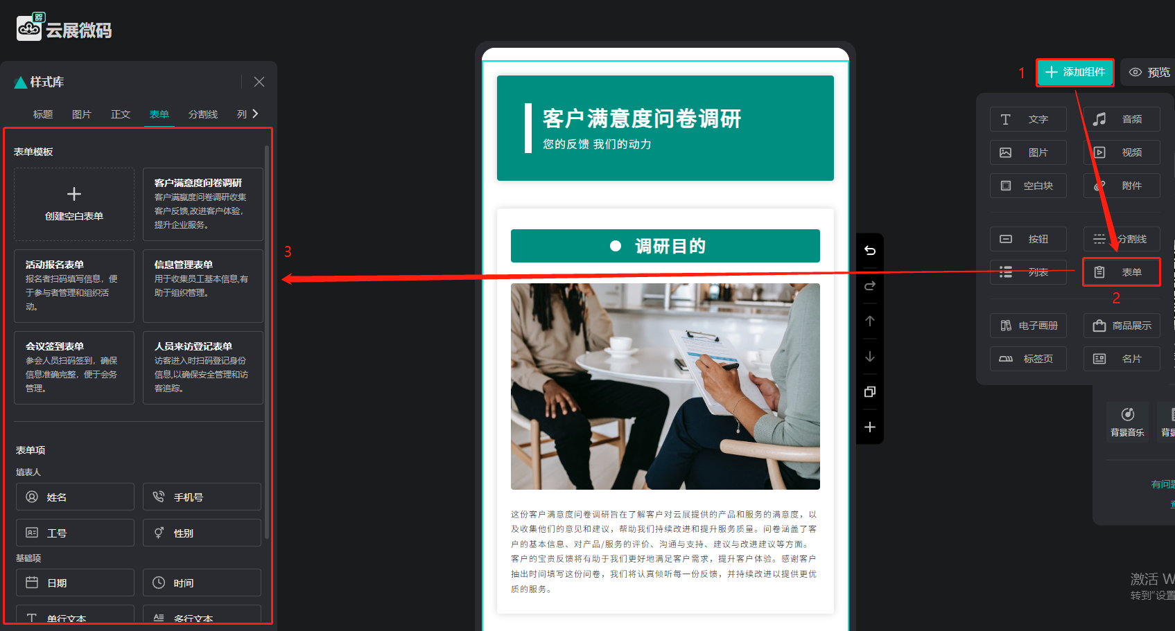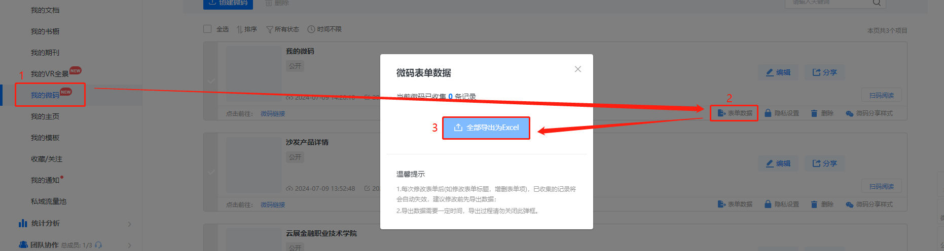 如何在微碼上添加表單? 一、功能介紹 此功能是指可以微碼上添加表單,讓讀者填寫,了解用戶信息,并且后臺還可以下載收集到的表單數據。 二、操作步驟 1、打開微碼的編輯器 點擊【我的微碼】,點擊需要操作的微碼的【編輯】。 2、添加電子畫冊 點擊【添加組件】,點擊【表單】,左側選擇【表單模板】,如有需要也可以添加【表單項】。 3、保存 點擊右上角【保存】。 4、導出表單數據 點擊【我的微碼】,然后點擊【表單數據】,最后點擊【全部導出為excel】,即可查看收集到的數據
