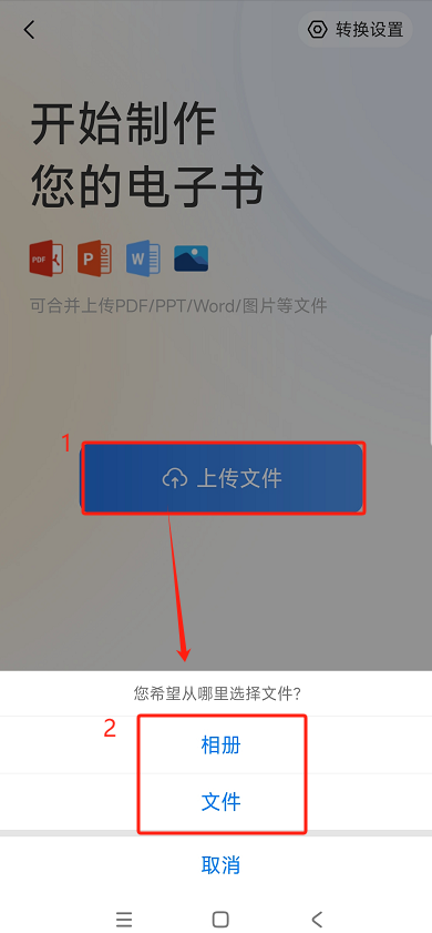 在首頁,點擊【上傳文件】,隨后再點擊【上傳文件】,選擇文檔上傳,可合并上傳pdf/word/ppt/圖片等文件