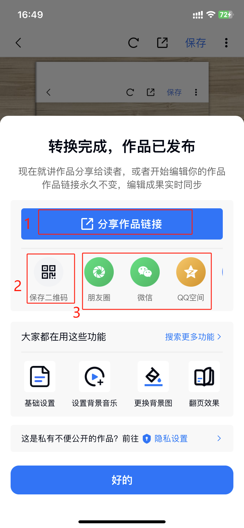 上傳轉(zhuǎn)換完以后,頁面會彈出:“轉(zhuǎn)換完成,作品已發(fā)布” 的提示界面。您可以將作品分享給他人查看。