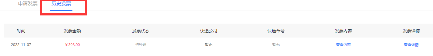 4、在歷史發票可以查看您申請的發票內容,寄送單號等。