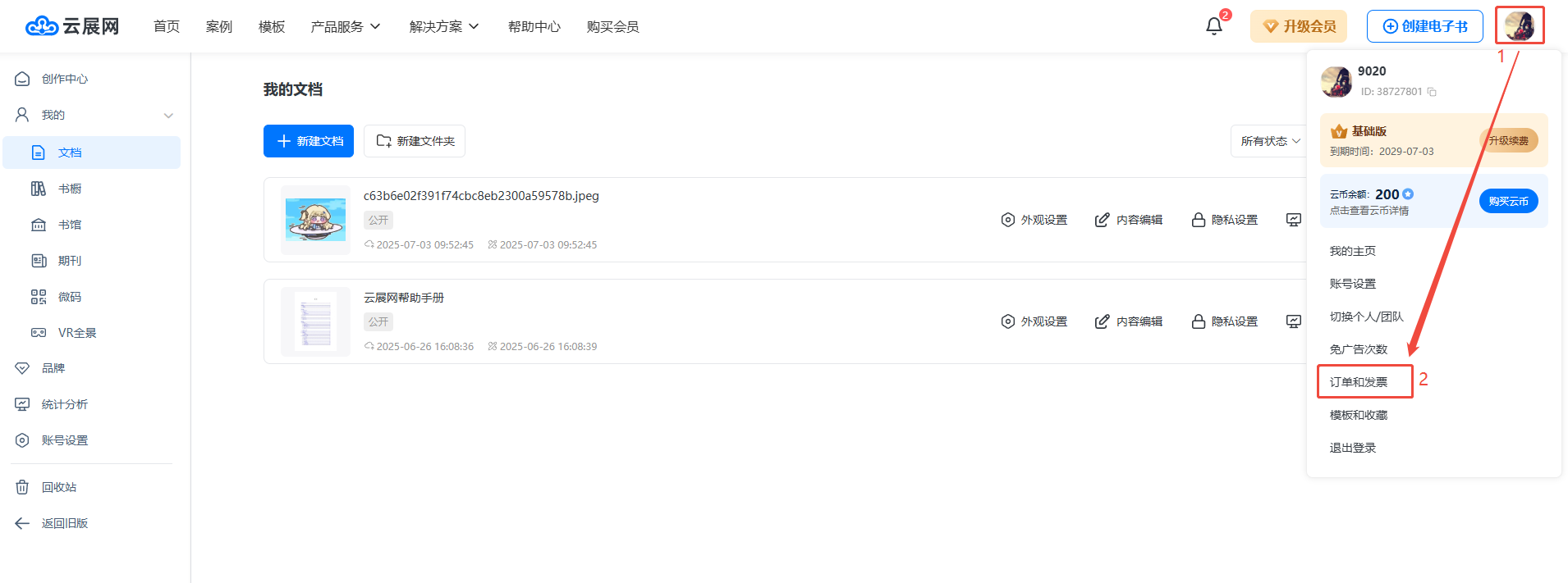 1、登錄云展網賬號,然后點擊右上角頭像,點擊【訂單和發票】。