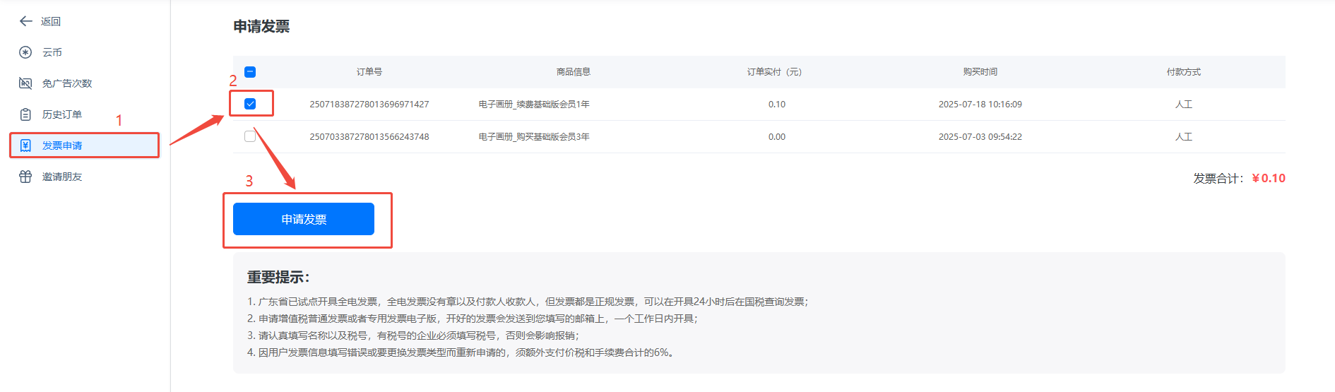 只要是在云展網支付了款項,金額超過0.1元的訂單,都可以申請發票。