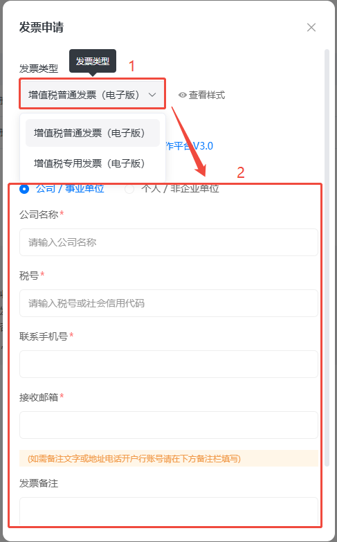 發票類型有:增值稅普通發票(電子版),增值稅專用發票(電子版)。